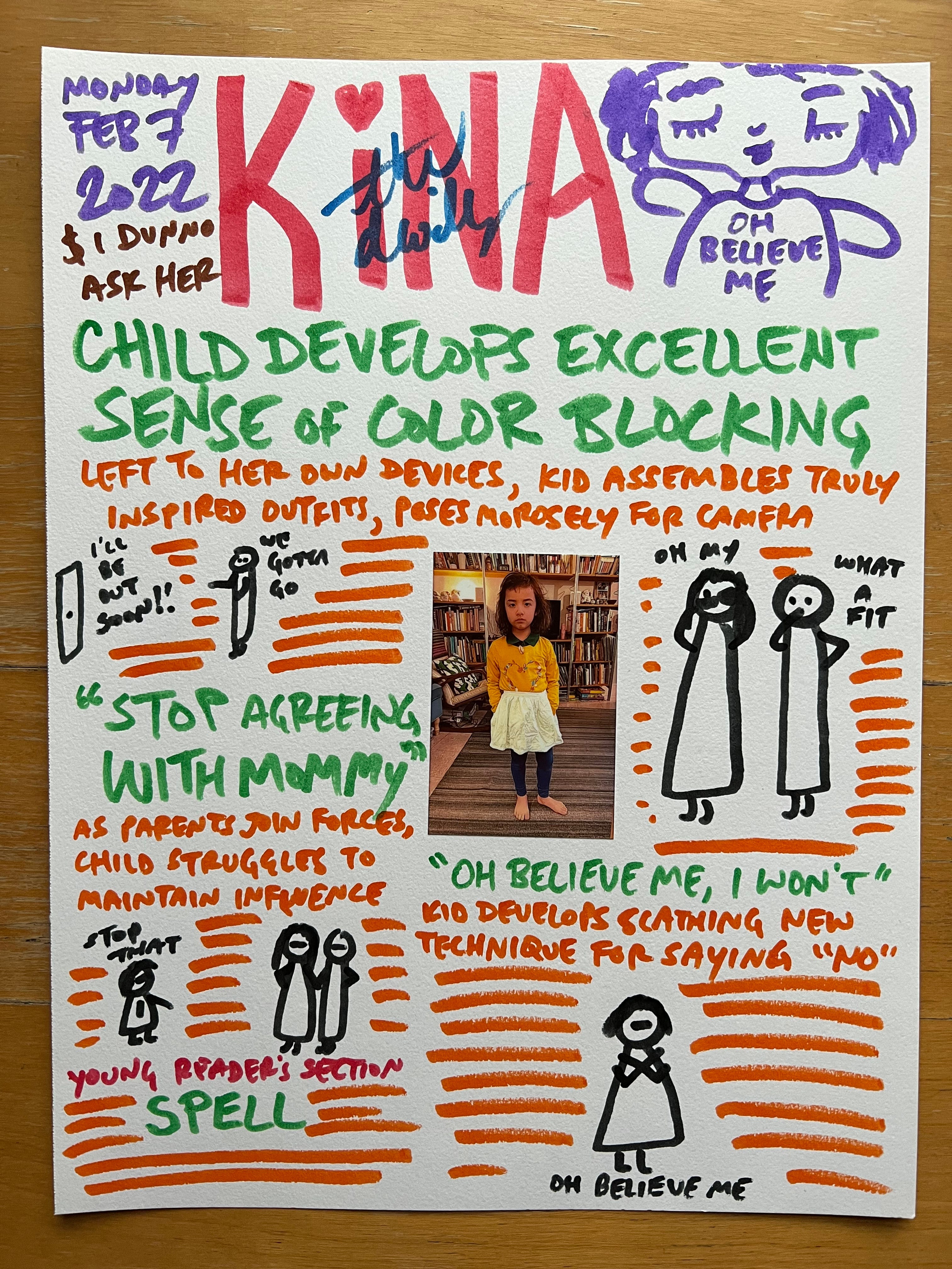 We have entered the beautiful phase of Kina’s sartorial self-sufficiency in which we can walk away for twenty minutes and return to find her fully dressed in something other than an Elsa costume. Yesterday’s fit was so crispy, and her vibe so moody, that I couldn’t figure out how to catch it in washable markers—so you are all now witness to the first actual photo in an edition of The Daily Kina.