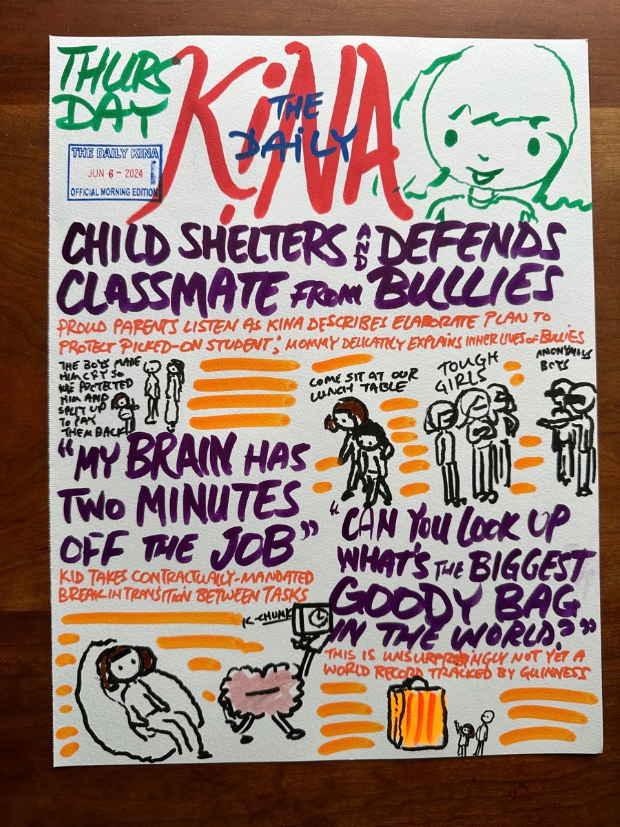 Everybody’s staying anonymous here, but I am proud of Kina and her tough girl classmates for standing up for a boy in her class who got the short end of the bully stick. As angry as it makes me to hear about these things, I have to remind myself that these kids are seven and eight years old, and that their behaviors are just an extension of their own experiences—much like the behaviors and neuroses of their adults. It’s hard to explain that all to Kina, but it’s a lot easier when you know she’s confident enough to protect the people who need protecting. She can spend the rest of her life becoming familiar with the virality of trauma, but she’s kind today.