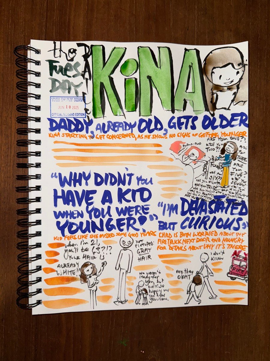Kina is getting really sensitive about her parents growing older, and since I am generally regarded as The Eldest In The Family, she’s extra touchy about my age and gray (not white) hair. It has been sort of interesting to note how much more she is worried about my getting old than I am worried about my getting old, because I think I have much more to lose in the bargain here. Still, it’s touching to think about what I mean to her and why the idea of my not being here someday makes her nervous. I remember feeling that way about my own father when I was younger—maybe a little bit older than Kina—and wanting to make sure he was wearing his seatbelt and driving carefully. I still worry about him and my mom in the ways that Kina worries about me and Laurea, but I have a lot more life with them than Kina has with me. I can’t do a whole lot to assuage her concerns about mortality, but I have at least promised her that I will drive carefully.
