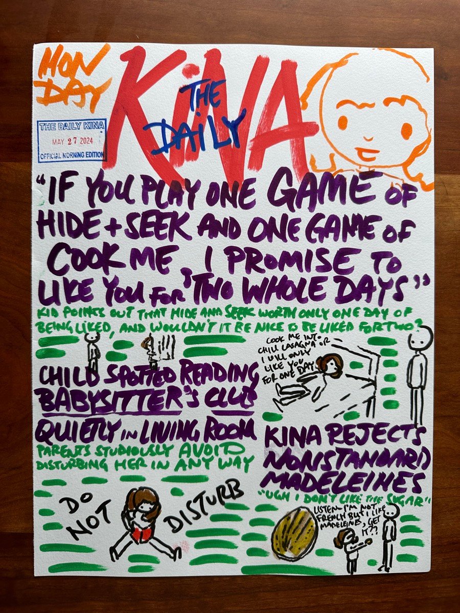 Reader, I decided I would be liked for two days, and I ended up having both to find Kina in one of her many nooks, and also to pretend to use Kina as ingredients for “chili lasagna”. It all took about half an hour, and I would like to point out that she already didn’t like me by this afternoon, when I told her I wouldn’t listen to one particular twee decade-old ballad in the car multiple times.