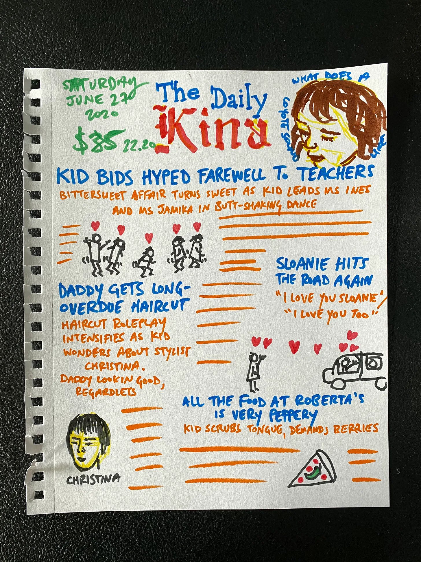 This is the eighty-sixth edition of the Daily Kina. The first edition was published on April 3, 2020, just as we were emerging from a family-wide bout of COVID-19. It was drawn entire in blue crayon, cost twenty-five cents, and led with the headline “YOU A CHEESE FIEND HUH”. Today’s edition, like every one of the preceding ninety-five, took shape in about thirty minutes while Kina was running around asking for “special treats” and stealing markers from me. I ripped it out of the notebook, took a picture of it on the trunk in our bedroom, and taped it up on the cabinets so Kina would know what the news of the day was without having to spend [checks image] $22.20 on a personal copy.