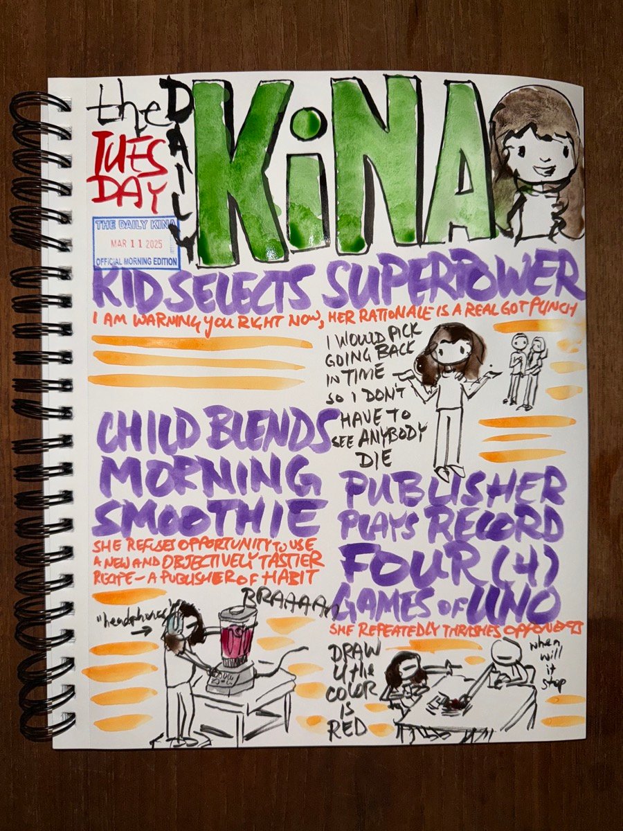 I think the alternatives she gave to us, her parents, for the ideal superpower were “going back in time” and “transporting yourself”, but she has picked “going back in time” so that she can live her life again and again and never lose the ones she loves. I think I’m still just a little heartbroken. I want us all to live forever, which is a superpower all unto itself, but it might also be nice to go back with Kina and the rest of my family to, well, another time.