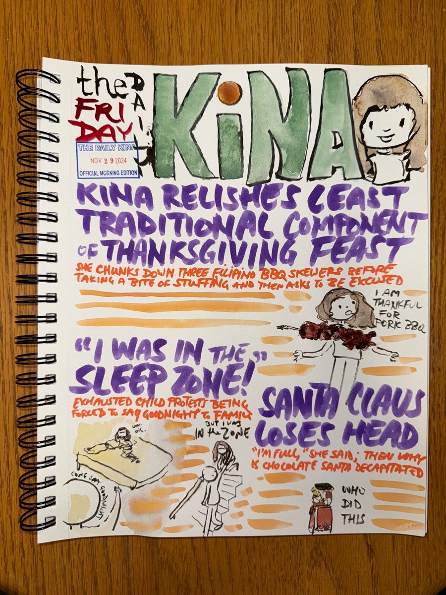 I am extremely proud of the increasing time-consuming pork BBQ skewers I made on Thursday (which included making my own banana ketchup, which was recently banned in the U.S., “because of some stupid additive,” as Laurea pointed out). The skewers were the star of the show, especially if the diner is Kina. I put about the same amount of work in for the stuffing and got considerably more lukewarm feedback from our house critic, which tells me something about how she values tradition.