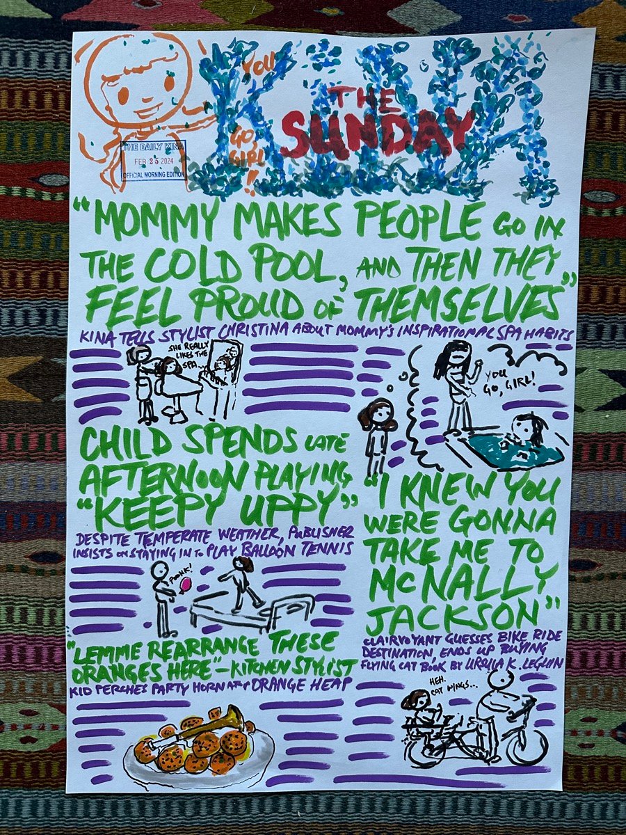As today’s headlines might suggest, Laurea spent a good part of the day at the spa, and the only things Kina knows about spas are that Mommy loves the hot saunas and encourages strangers to jump into the cold plunge, screaming at them to “get in there!” People apparently enjoy this. Kina and I are skeptical.