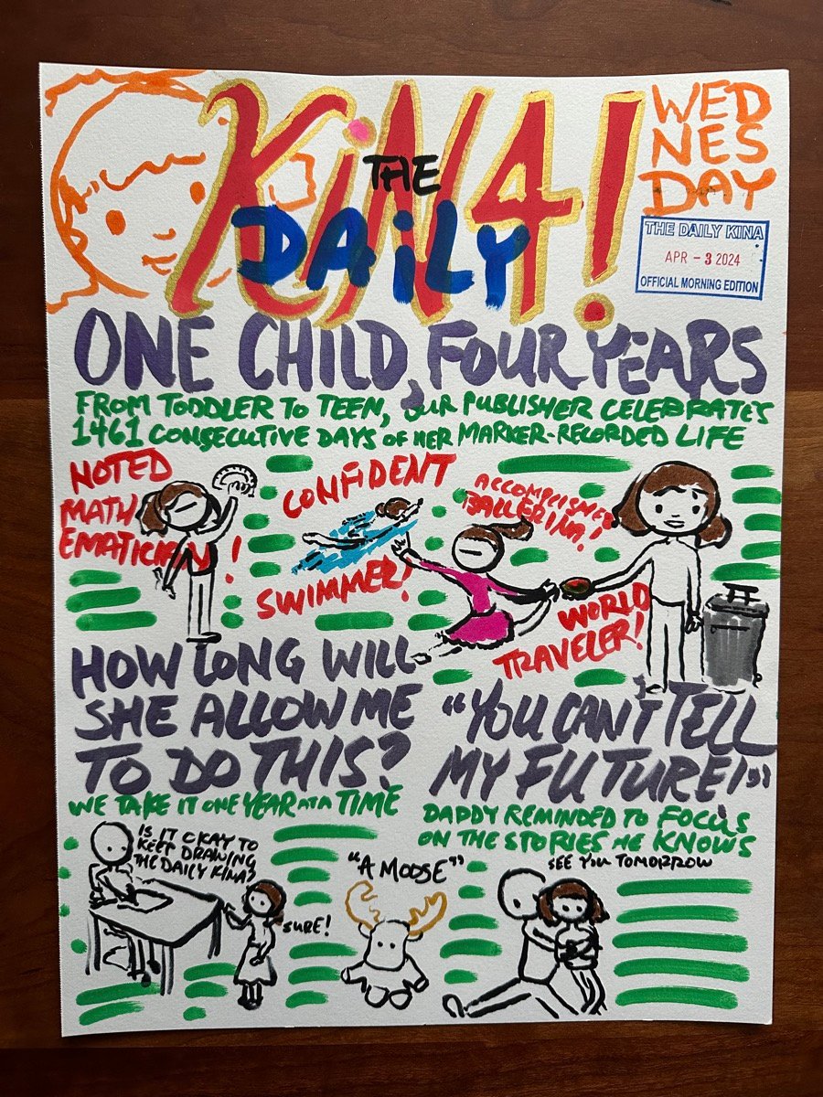 On a shelf in Kina’s room are one thousand, four hundred sixty one (1,461) editions of The Daily Kina. They represent a story about every day in her life since that day in April of 2020. They record what I love about her, and what is beautiful and ridiculous about her. They reflect her in ways she asks about most days, as she reads the headlines from her bath, in view of the cupboard I tape the paper to every single morning. They are a record of her, of the moment, of the city, of the people around her, and of me.