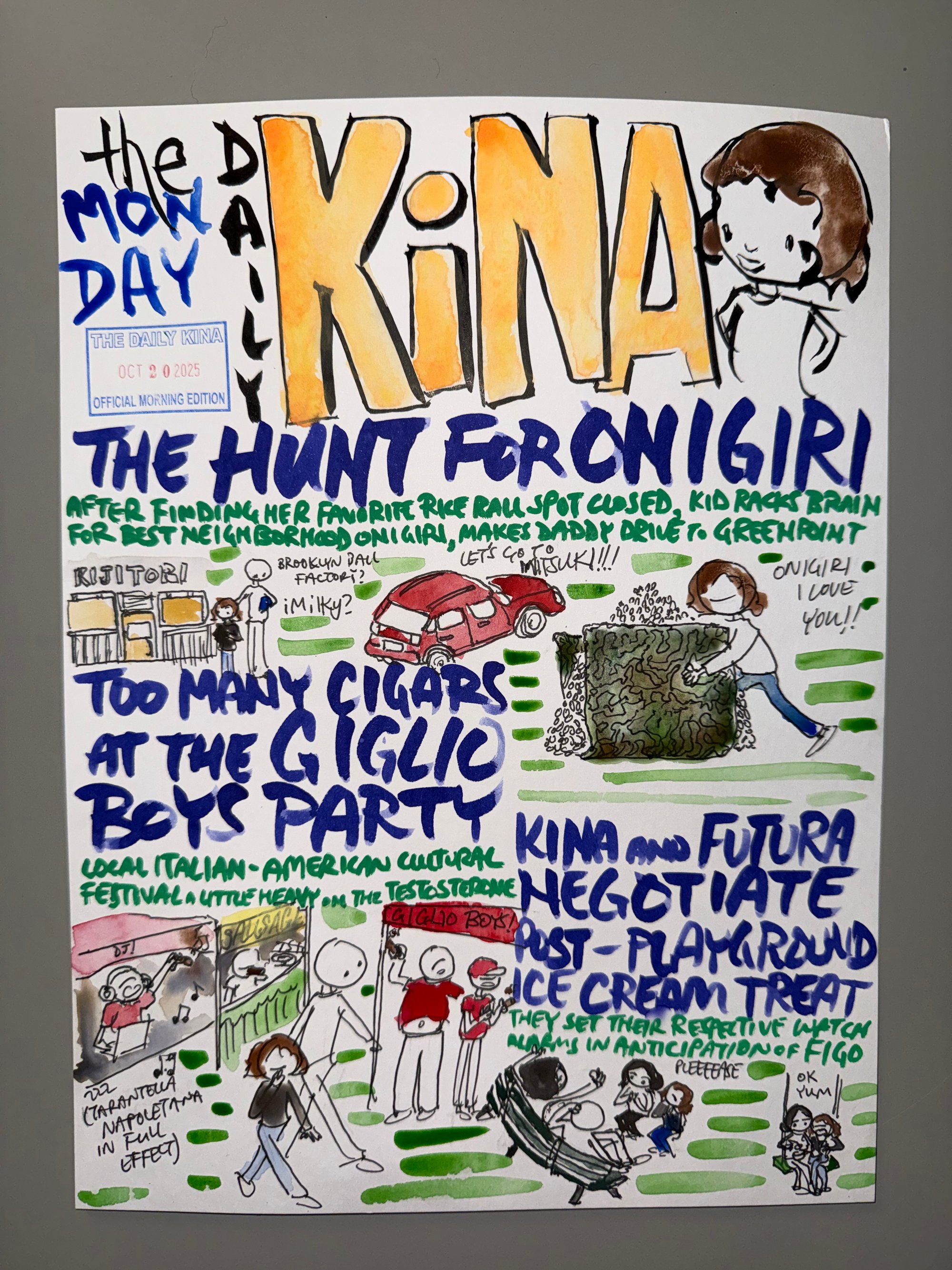 after finding her favorite rice ball spot closed, kid racks brain for best neighborhood onigiri, makes Daddy drive to Greenpoint